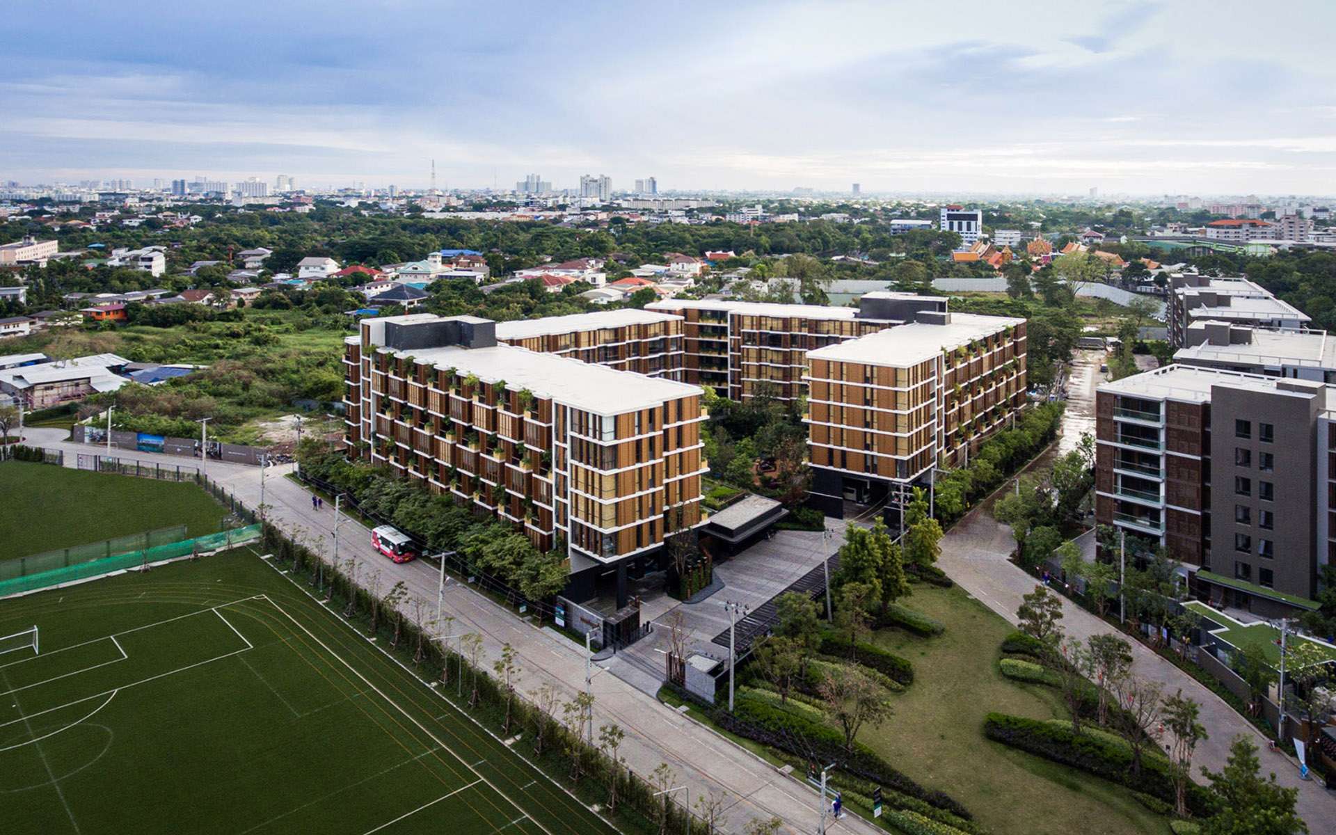 Hai tòa nhà bảy tầng nằm dọc theo khu đất để tối đa hóa khu vườn chính và một tòa nhà một tầng nằm trong không gian mở giữa hai tòa.