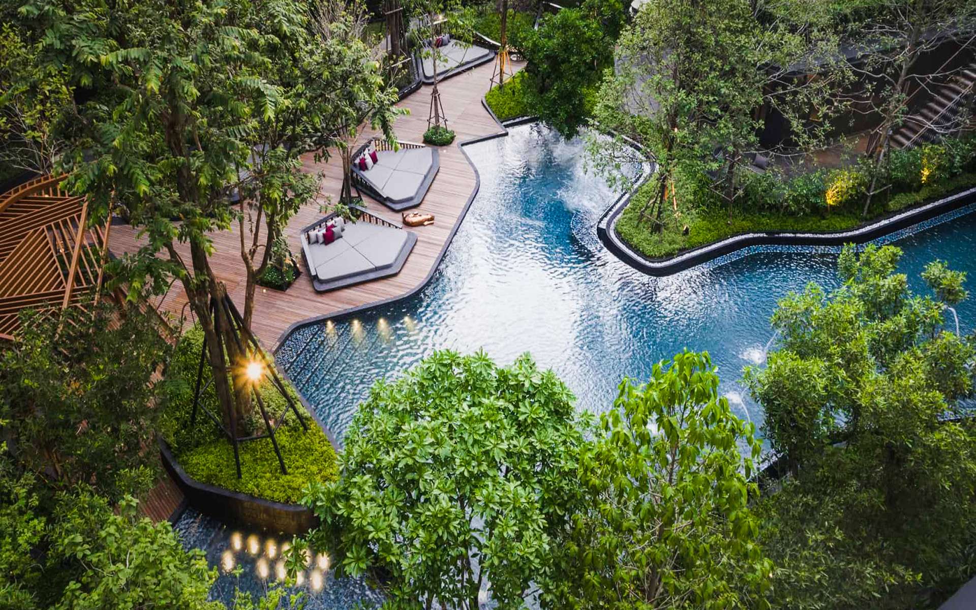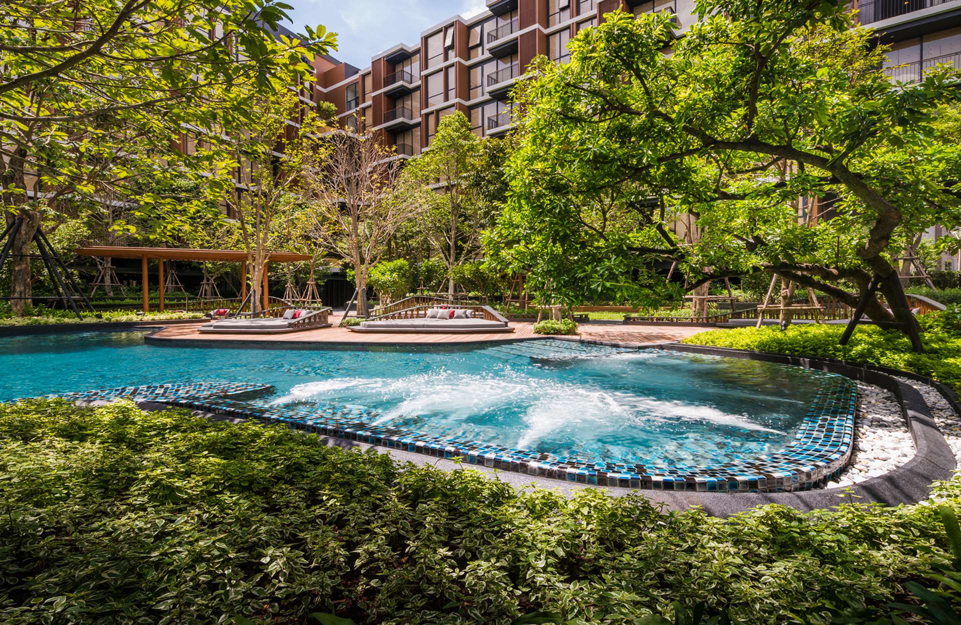 Xung quanh hồ bơi có những chiếc ghế lưới, xích đu, ghế nằm lớn để mọi người thư giãn. Một điểm nổi bật khác của khu vườn là sự đa dạng của các loài thực vật hoang dã, thực vật ven sông, dương xỉ, hoa thơm, đồng cỏ tự nhiên,...