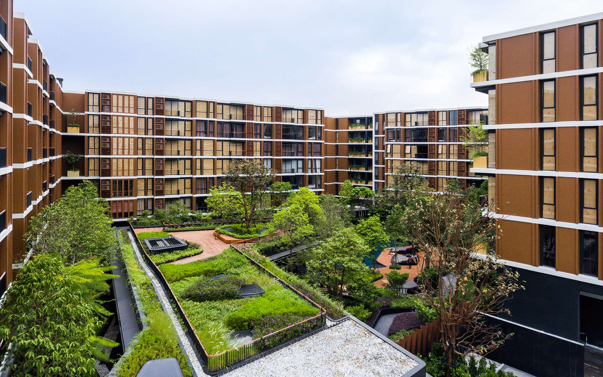 Khuôn viên của chung cư được thiết kế theo dạng “thung lũng”, tòa nhà bao quanh khu vườn như một ngọn núi với cây cối um tùm.