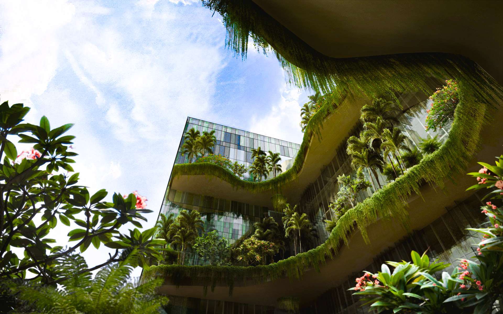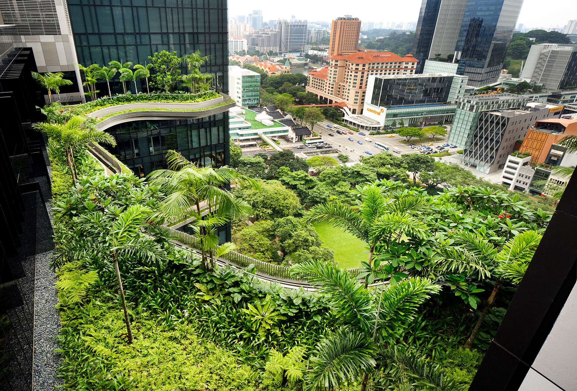 Cây trồng ở mỗi tầng khá đa dạng, từ các loại cây bóng mát lớn đến các loại cây bụi, hoa và dây leo… đã tạo nên một thảm thực vật xanh tươi, một không gian nhiệt đới xanh mát giữa lòng thành phố nhộn nhịp.