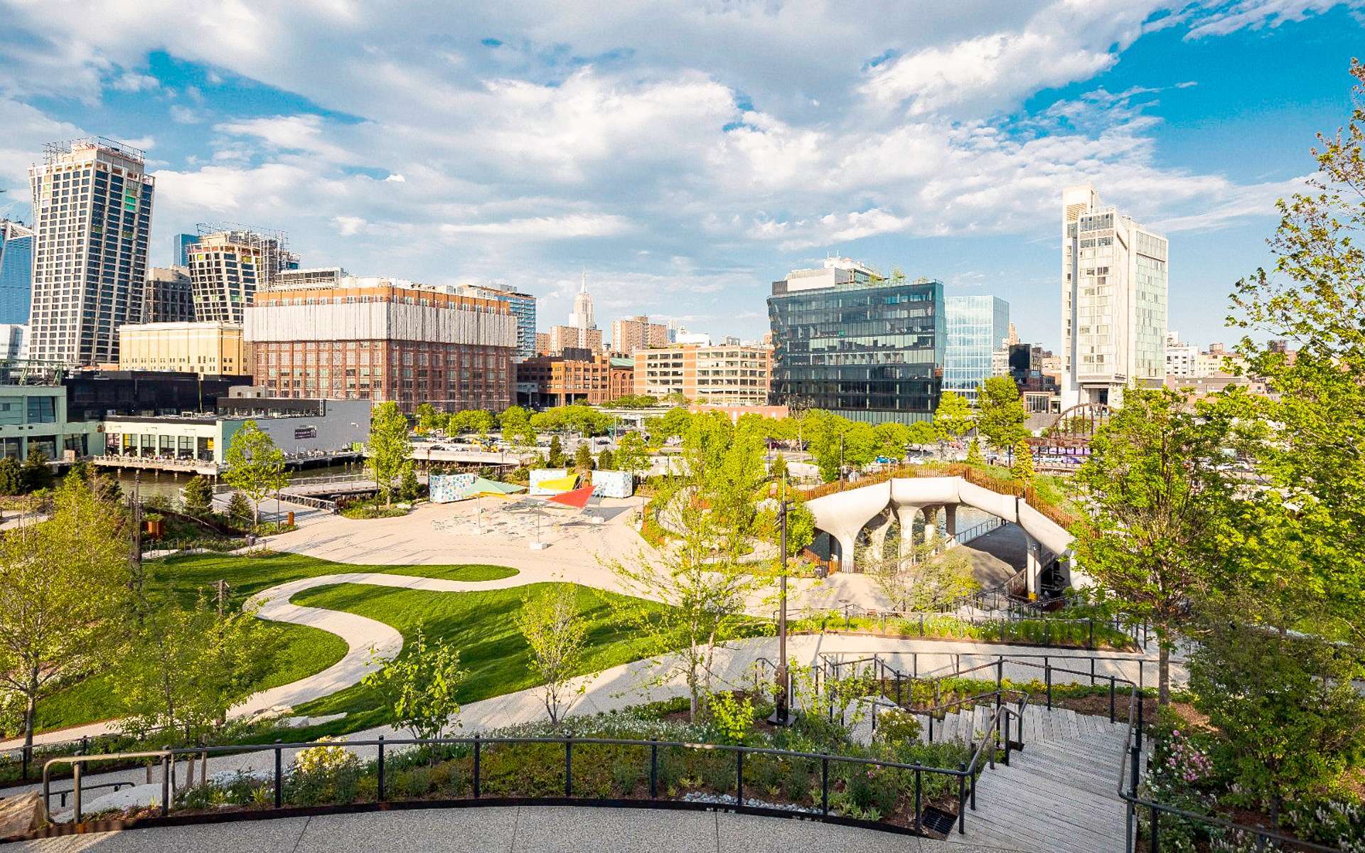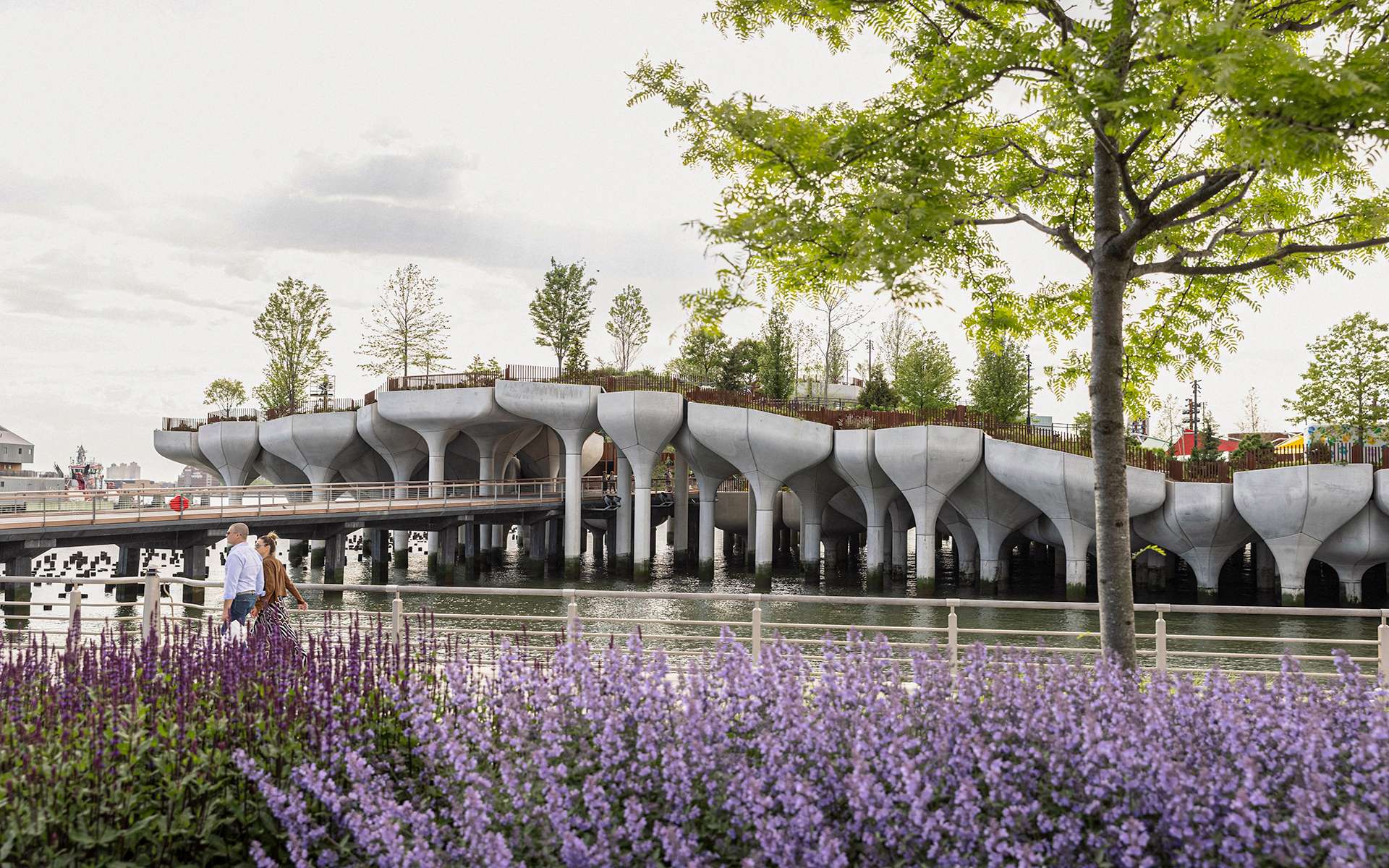 Công viên nối liền bằng chiếc cầu đi bộ được lát gỗ dẫn đến những điểm cao nhất của Little Island để có thể ngắm toàn cảnh xung quanh. Công viên chăm sóc hơn 350 loại hoa và cây bụi, cây lớn, mang đến một không gian cảnh quan tươi xanh và mát mẻ tràn đầy năng lượng.