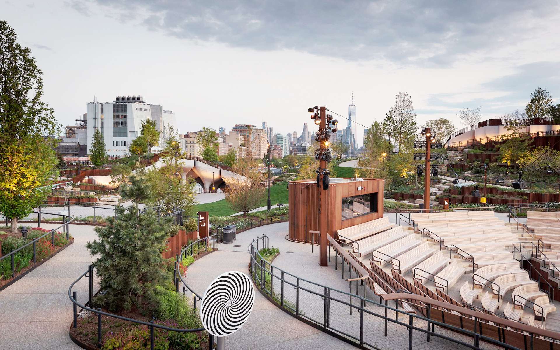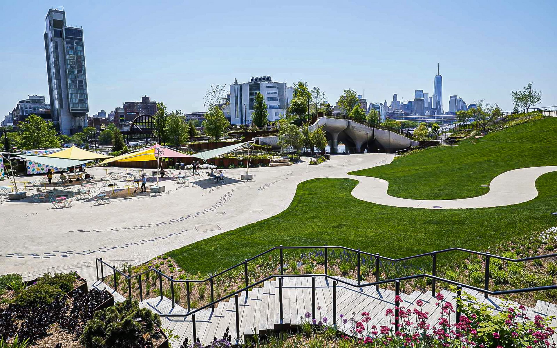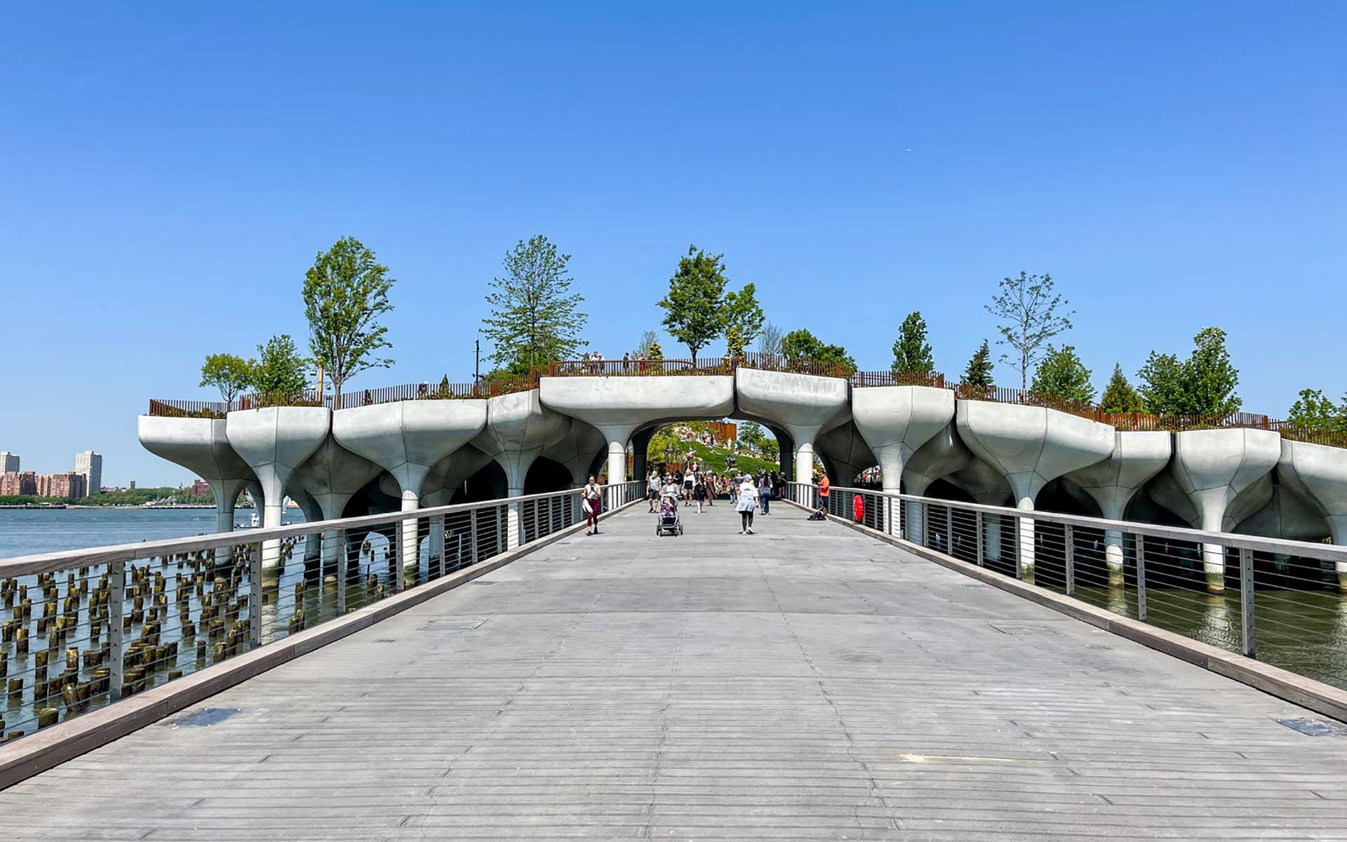 Cầu đi bộ được lát gỗ dẫn đến những điểm cao nhất của Little Island.