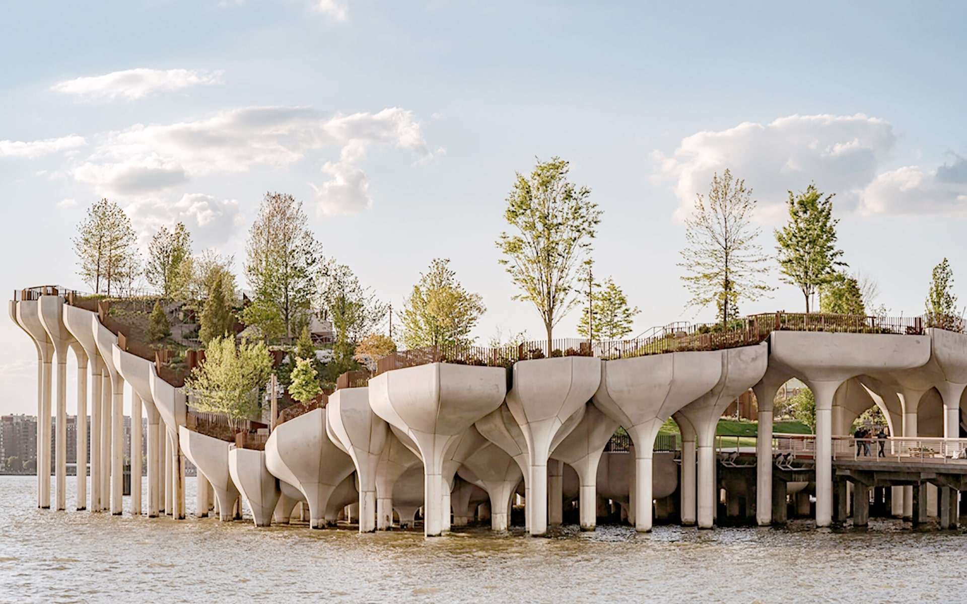 Little Island có thiết kế từ 280 trụ đỡ hình phễu như những bông tulip khổng lồ, mỗi bông tulip bê tông này nặng khoảng 75 tấn được đúc tại New York rồi vận chuyển khoảng 210 km tới sông Hudson. Những bông tulip này đã trở thành những mái che lớn cho du khách vào những ngày nắng nóng.